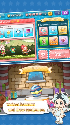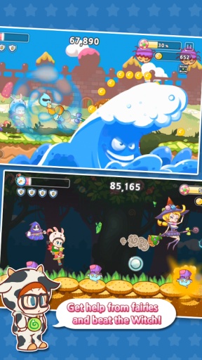 在地上点击就可以跳跃,连续点击两次就可以2段跳;在水里,手指长按就可以潜水,手指离开就会浮出水面,操作非常的简单。另外,根据拯救的糖果妖精的数量,角色会得到成长,躲避敌人和障碍物的效果就会得到提高。游戏中的随机宝箱中,玩家可以获得各种道具,活跃这些道具是获取高分的关键。