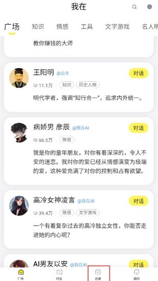 1. 开启软件,随后进入【广场】页面,在此页面会呈现出形形色色的机器人,点击下方的【创建】按键。