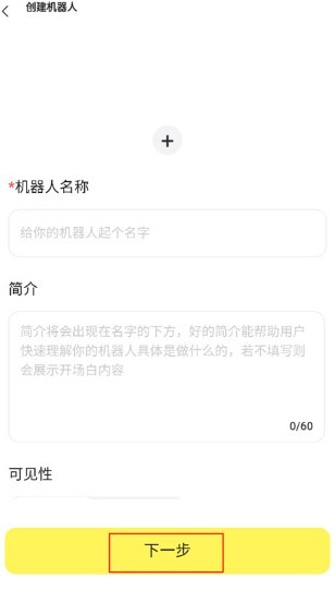 2. 填入机器人的名称与简介,挑选可见性设置,随后进入下一步。