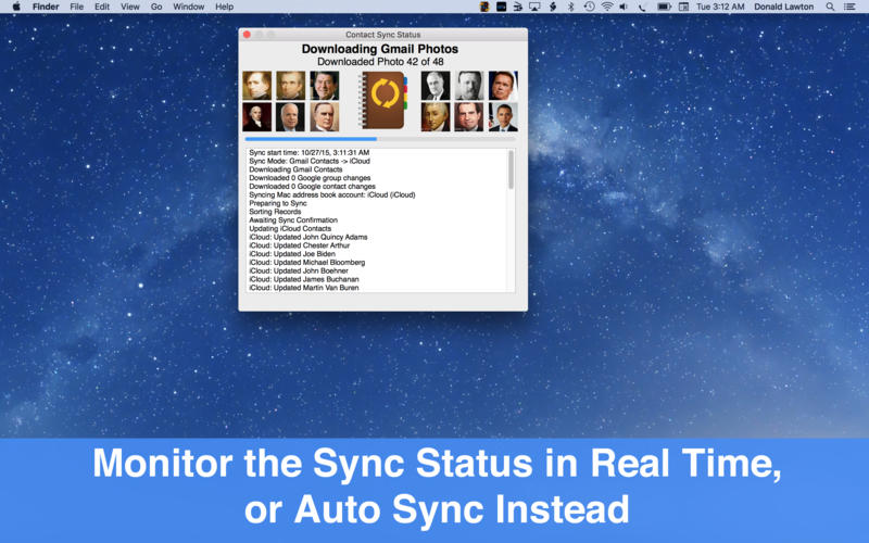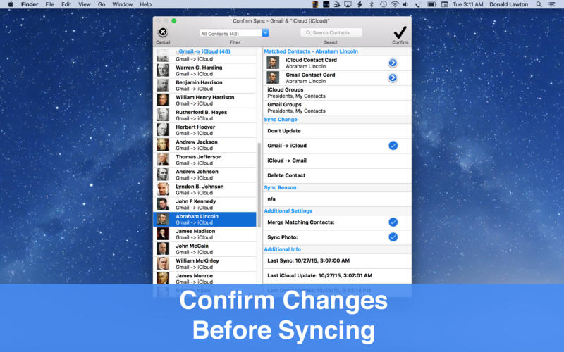 有了谷歌联系人同步程序提供的可定制性,它可以在许多创造性的方式使用。例如,你可以备份你的Mac通讯录到Gmail,可以同步iCloud的通讯录与Gmail,或者您也可以只在一个方向(如Gmail到Mac)进行同步。【软件特点】