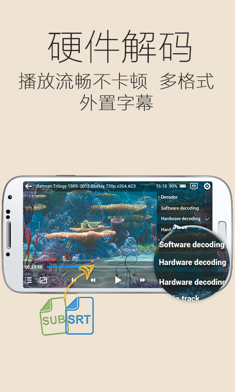 - 将安卓手机的强大的硬件发挥到极致,超强的硬件解码,带来流畅完美的1080P视频播放。- 根据需求选择软件解码、硬件解码、硬件解码+