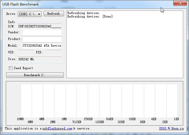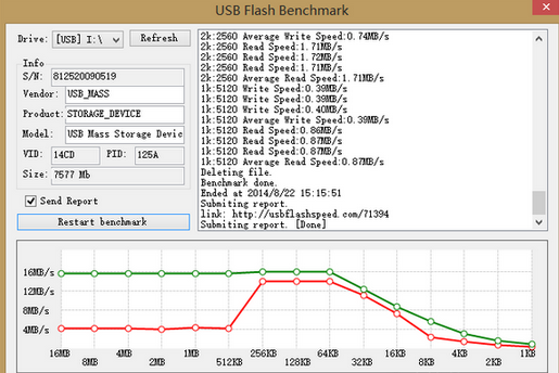 插入设备后运行 USBFlashSpeed,选定盘符后 USBFlashSpeed 会出现该设备的一些基本信息,不过如果你是通过读卡器的话就无法正常读取到该卡的信息了。点击「Benchmark」按钮就可以开始对设备进行读写速度测试,USBFlashSpeed 会通过写入读取不同大小的文件来测试,左侧会显示文字结果,下方会通过图表的形式来显示。