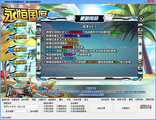 海底隧道(可得白、蓝色时装及解锁道具)、御剑术、筋斗云、修复游戏黑屏、全屏秒杀、刷图娱乐、新手过任务、改五行、刷图必备、改倍数、改攻击、改血蓝、自定义修改等等。