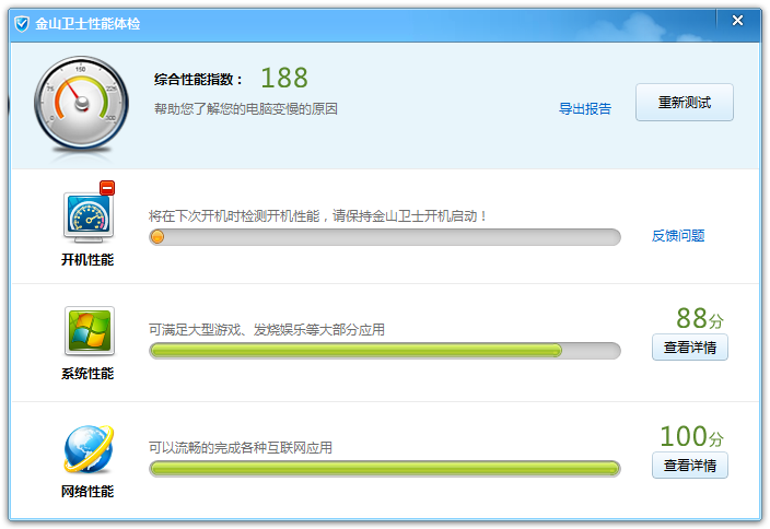 作为传统检测项目,开机速度检测能反应出系统在参数设置、健康程度上的基本现状。金山卫士深度优化了检测开机速度功能,此项检测功能5秒内可执行完成。
