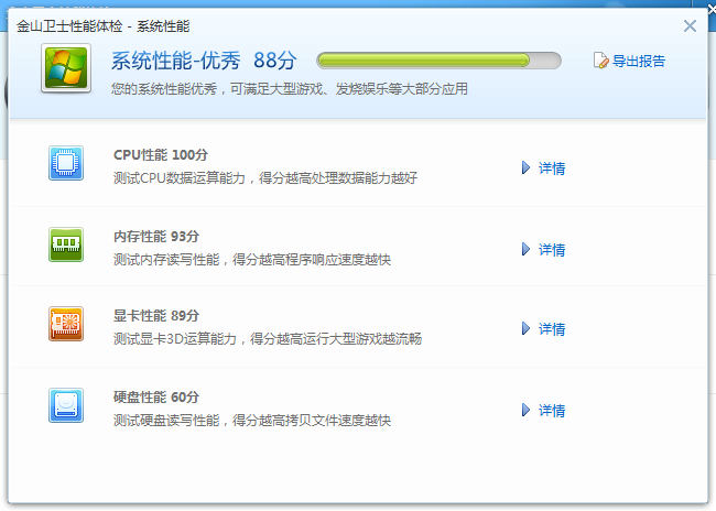 金山卫士性能检测的第三大是硬件设备的全面检测。硬件设备通常会影响到用户娱乐游戏、高清播放、办公应用的电脑操作体验。自从金山网络收购驱动精灵以来,金山卫士在硬件检测领域有了强大的信息共享支持。金山卫士能检测CPU性能、内存性能、显卡性能、硬盘性能。