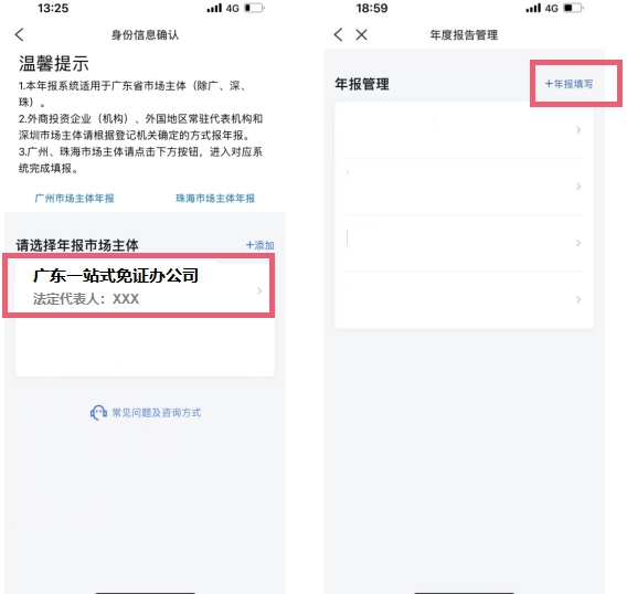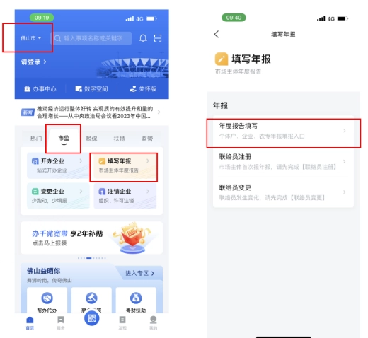 1. 轻点首页左上角的位置信息,从中挑选年报市场主体所处的城市,接着点击【市监】-【填写年报】-【年度报告填写】,完成人脸识别验证后,就能顺利进入年报系统。