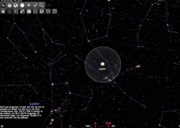 3D 天文馆,包含行星和卫星,3 种不同视图,采用逼真的纹理和视觉效果,对应三种不同 3D 对象的细节级别。 实时或快进显示太阳系的 3D 动画,包含每个行星的知识。 包含行星、恒星、深天体、彗星和卫星的实时岁差的 3D 天图。彗星和卫星的运动轨道通过 6 个不同数据库(包含 IAU 小行星中心)进行更新。 显示包含日出和日落的世界地图太阳时钟。 支持多点触摸触控板(某些设备)的双指开合缩放功能,进行放大和缩小。 通用搜索引擎。 基于位置的天气信息获取。