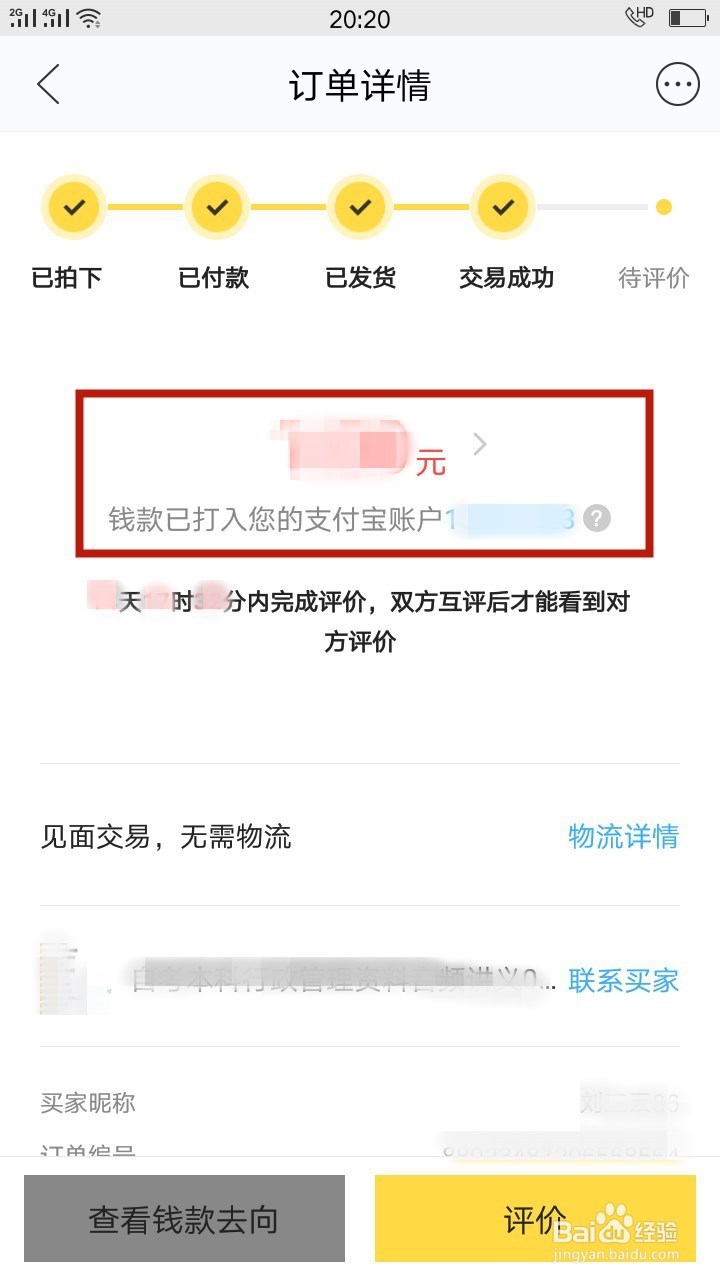 此时订单详情页面中间部位有提示钱款已打入支付宝账户。