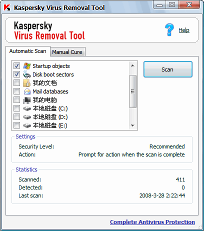 Kaspersky Virus Removal Tool V7.0.0.223(0610) 英文绿色免费版 Kaspersky Virus Removal Tool 是一个免费的应用程序,它是一个常见病毒扫描和检测软件(类似国内的专杀工具).该产品可以找出特定位置的病毒并清除或隔离,详细病毒列表可以参看相关页面.