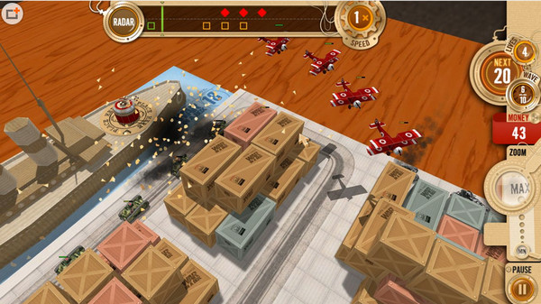 游戏中主要有进攻方和防御方。玩家负责防御方,主要进行防御建筑的搭建和升级,建筑自动攻击各有特色;进攻方由电脑进行操纵,主要有装甲车飞机等移动性目标。初始状态下给出重机枪和加农炮作为防御武器。重机枪可以进行三连发,攻击间隔小,但是伤害低,可对空攻击;加农炮攻击力中等,攻击间隔中等,攻击范围大,但是不对空攻击。