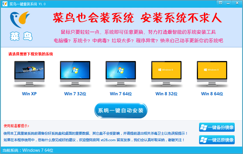 使用本工具重装系统前请备份好系统盘和桌面的重要数据、其它盘不会受影响,并请提前退出相关杀毒卫士以免误报提示!如果在本程序使用中,您有什么意见或好的建议,欢迎登陆官网 xt28.com 留言发表,我们会认真听取采纳,谢谢关注!