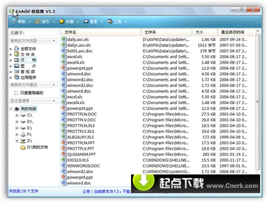 EeAdd-快易搜 V1.3.2 绿色免费版 EeAdd-快易搜是一款领先的硬盘搜索工具,可以方便的查看硬盘上文件资料,可以按分类、按时间、按目录来搜索文件,并对提供搜索结果中照片预览功能;搜索速度极快,支持千万级的文件搜索,搜索响应时间平均在毫秒级,支持多关键字搜索,同时提供对显示结果分页,用户还可以对结果文件