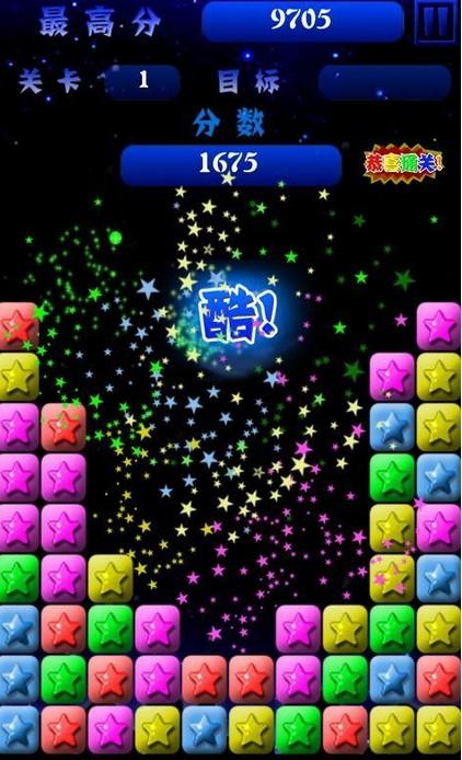 2、消除方法是,点击颜色相同成块的方块或者星星,它就能被消除。同时消除的方块越多分值越高。你也可以尽量让所有的方块被消除,那可是很厉害的。