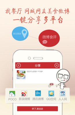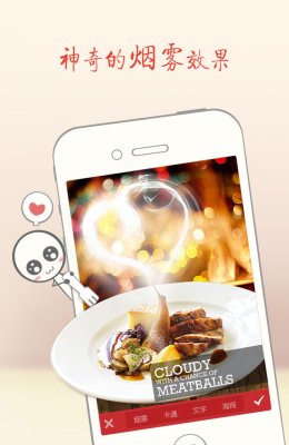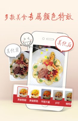 1、拍美食! 手机上最好的美食照片颜色滤镜,各种美食装饰及趣味相框,更有独一无二的美食烟雾效果, 让你的美食照片变得好看有趣!2、发微博!一键将美食图片分享到POCO、新浪、腾讯微博等多个平台 ,更可让您的微博上直接出现餐厅信息和介绍,吸引更多粉丝的关注!