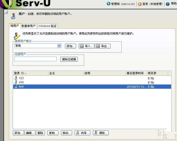 往往我们的FTP帐号需要访问虚拟目录,那我们来建立一个虚拟目录让用户访问,第一步打开Serv-U软件,在软件主界面,选择用户--创建、修改和删除用户,如下图所示: