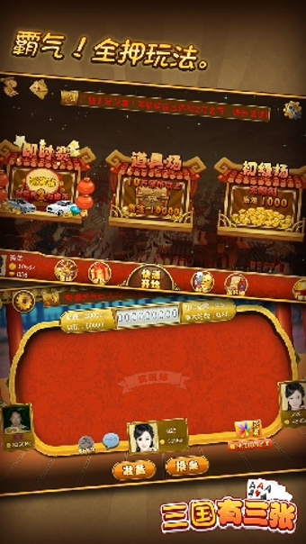 三国有三张以“三张牌"玩法为主,三张牌是在全国广泛流传的一种民间多人纸牌游戏玩家以手中的三张牌比输赢,游戏过程中需要考验玩家的胆略和智慧,三国有三张是被公认的最受欢迎的纸牌游戏之一。