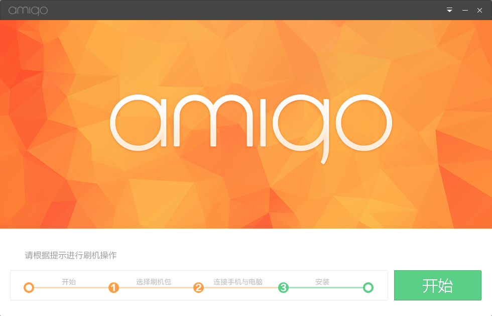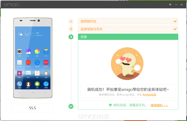 注意:由于是amigo刷机小工具是系统级工具,目前V1.1.0版刷机会清除包括个人照片在内的所有手机数据,刷机前请务必备份所有资料。