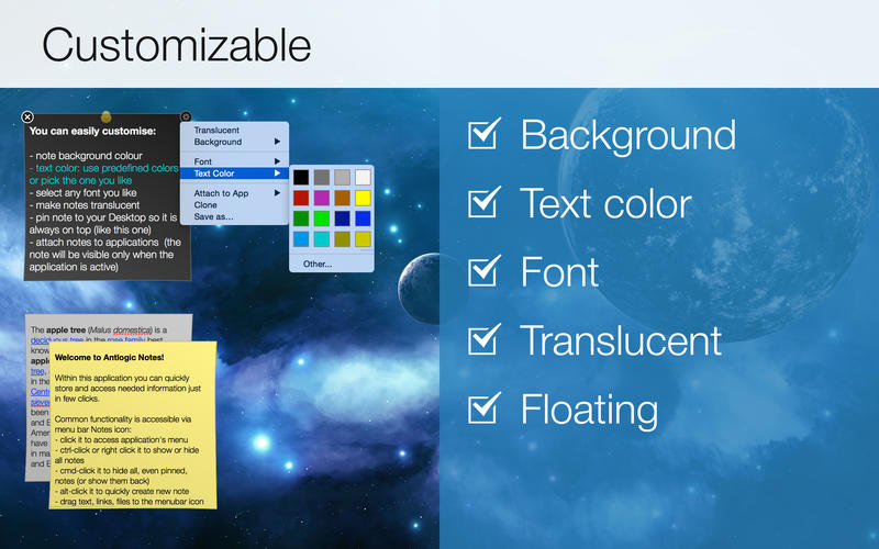除了基本的记事功能外,它还具备有以下特殊功能:便条纸的颜色、尺寸、边框都可设定调整,并可在桌面上四处贴。可以自行设定文字的字体、颜色及大小,而且内容若包含有URL或邮件位址,还可直接透过关连软件进行连结或开启。单一或重复的闹铃提醒及逾期通知功能。便条纸具有缩小化及隐藏功能,缩小化只会显示第一行标题文字。提供有便条纸管理介面(Note List),可以让你浏览目前摆在桌面以及隐藏起来的所有便条纸。强大的字串搜寻功能可以帮你找出特定的备忘内容。完整的打印功能。多组的热键功能可以让你更方便随手即写即贴。