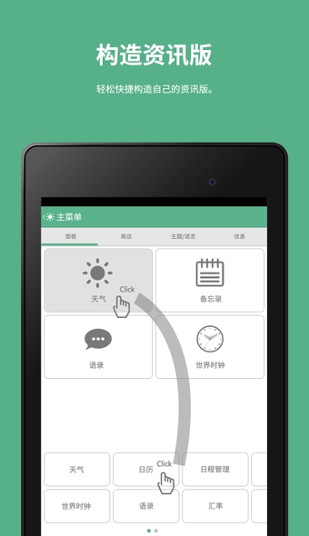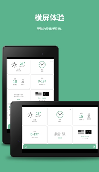 工具功能:10种以上工具包括:天气、相框、新闻、日程管理、日历、世界时间、汇率、日期倒计时、备忘录、Flickr、语录等等(未来会有更多)