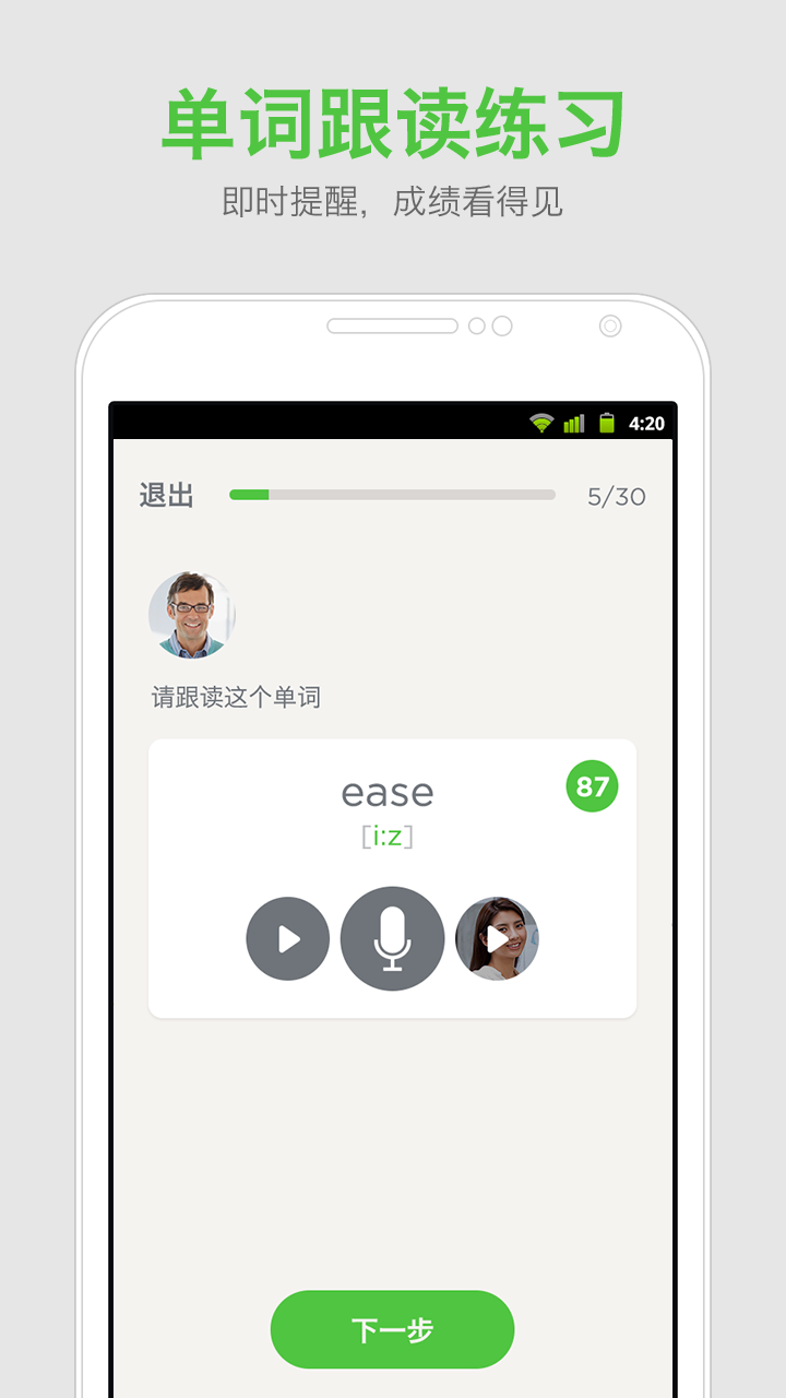 跟读单词,系统及时反馈,边练边测,成长看得见。
