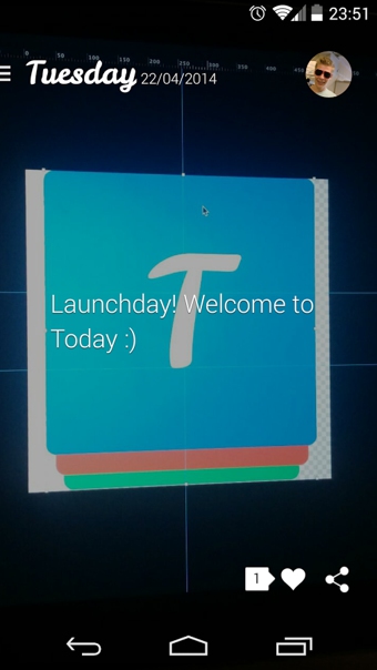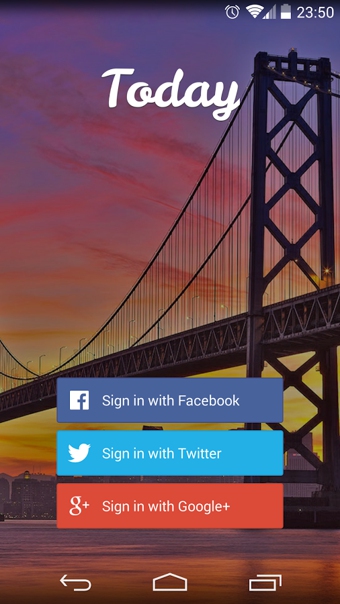 Today日记是一本特殊的日记,分享每一天最特殊的时刻,每12小时只能发布一则日记。登录Today,和Facebook、Twitter或Google+的朋友分享你一天中最精彩的时刻。今天是有点像一个社会的日记,你可以共享一个时刻,作出了特殊的一天。每个人都允许一个岗位,每12小时,所以不要只是张贴任何东西,发表的东西,使你一天的特别。