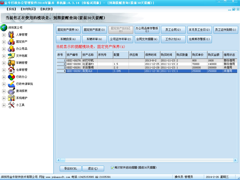 10、到期提醒查询:资产保养提醒,资产报废提醒,资产归还提醒,员工合同提醒,员工生日提醒,车辆投保提醒,车辆年审提醒,公司证件年审提醒