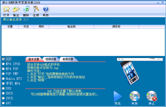 手机(MP4、3GP):转换后的文件适合各种支持MP4、3GP的手机播放;