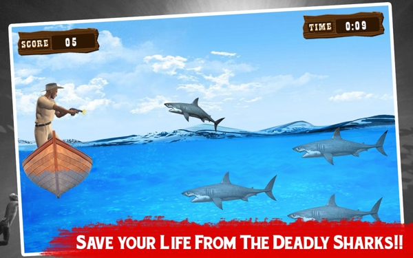 发挥前海; 你的任务是清理海滩附近的区域,距离这片海域的食肉动物,所以你可以节省人们的生活,从饥饿的鲨鱼。你不希望其他人的生命处于危险之中的,为什么你独自坐船。当心愤怒的大白鲨攻击; 它会跳到你张开钳口杀你一杆。这就是为什么你只有一次机会杀了他们。