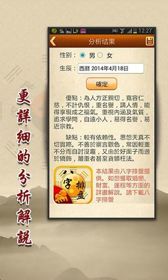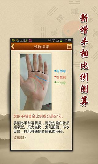 看这里,看这里,看看你的生命线有多长,知晓预知生命的长度,在有限的时间创造更大的价值,看看你的事业线有没有波折,怎样可以乘风破浪,在事业海洋里一帆风顺,看看你的婚姻线,学业,预知在你自己身边的运程小秘密!~最好的手相测算应用。只要您拍照完手型后用手指照着右上角的模型去画自己的感情线,智慧线,生命线。就能快速准确的帮您分析出你想要的结果,算出您的性格和未来的发展前程。手相很有趣,如果多了解手相命理的一二事,您就可以看见多姿多彩的世界!说它是不是手相测试却又包含了传统的合理知识,又结合了娱乐时尚,带给给您不一样的交互体验。