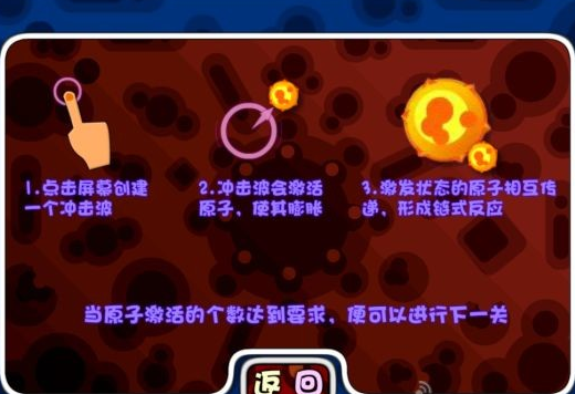 《链式反应》是一款轻松有趣的休闲类游戏。手指点击屏幕创建一个冲击波触发连锁反应~每一种原子被触发了之后都会有不同的反应。成片的原子相互爆破传递。玩家需要激活点目标个数的原子便可进行下一关。游戏有解谜模式和正常模式两种游戏模式,考验玩家们的运气,技术,耐心。一共有100余个关卡,占用时间不长,没有体力限制,随时随地想玩就玩~【游戏特点】