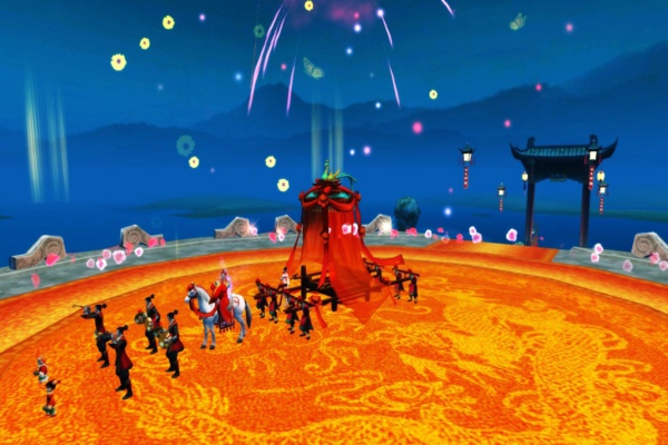 随着“情义”的上升,二人可以筹办婚礼,正是结为夫妻。一对准夫妻可以前往鹊桥仙境,从新娘所在门派亭阁开始出阁之礼,在1个小时限时内,达到一定积分,拜天地后正是成为夫妻。除了室外婚礼鹊桥仙境,还提供了供私人及其好友享用的室内婚礼琳琅阁。