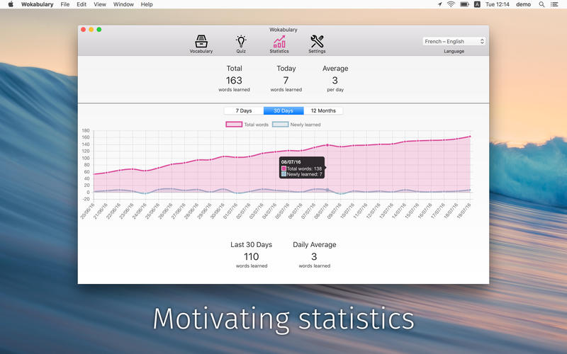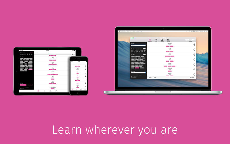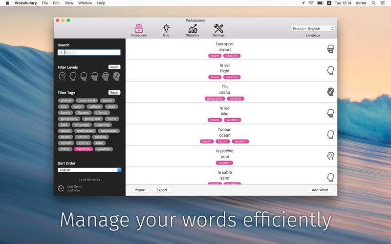 【1】Wokabulary是学习和排练的话新的,有趣和有效的方法。【2】就像闪存卡系统,你在学校有,Wokabulary组织你的话在不同的存储级别。这使得它很容易看到它的话,你已经知道了,还有哪些需要重新排练。