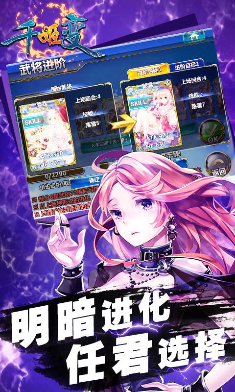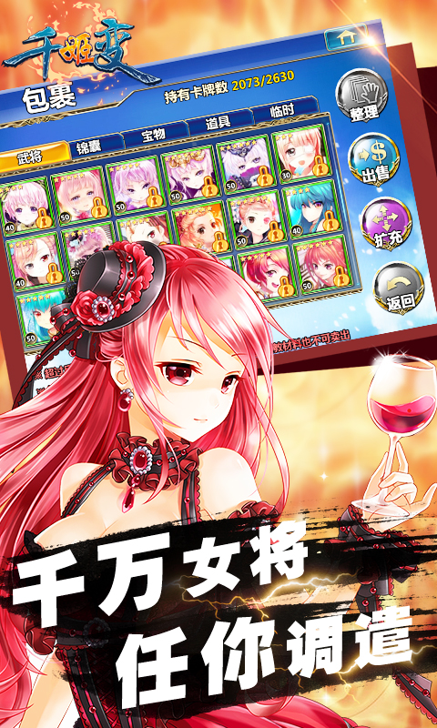 《千姬变》萌萌哒上线了!400张绝美美女卡牌,不同时代,不同性格,不同职业,其养眼规模不亚于世界小姐竞选!数百种技能、锦囊、四大势力的循环克制,糅合出无限可能的超丰富战略组合!绚烂的日漫画风与三国奇幻世界巧妙结合,您将化身为穿越到魍魉三国世界中的乱世主,上演一个个浪漫的奇遇!指挥您的战队,将巾帼武将从萝莉培养成长为绝色天下的美娇娘!【游戏特点】