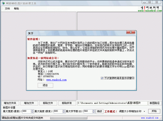 为了方便、简化广大网友在发布图片到网上之前的图片加工过程,啊玻刺得.图片批处理工具将批量的进行调整图片高度、宽度、字节数、增加水印等操作。在将自己的照片发布到网上时,该工具将会让你感到倍佳轻松、快乐、得心应手,它将在很短的时间内为你处理大量的图片。对于使用者而言,你所要做的就是将待处理的图片或图片所在的文件夹拖放到软件界面上,然后点击"开始"按扭即可。该工具有如下特点: