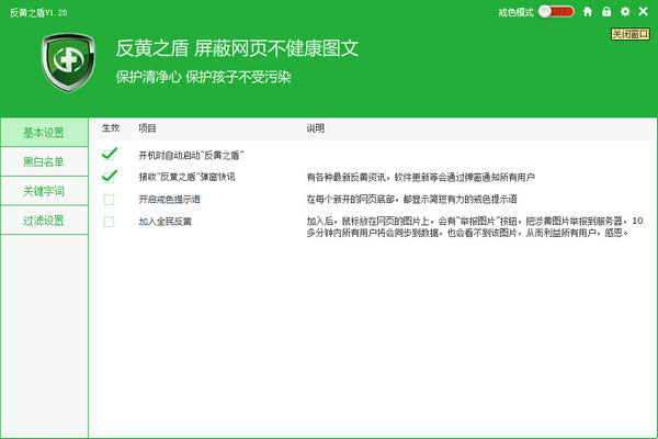 屏蔽网页中的不健康图片为达到较好保护儿童和青年人不受网络不健康信息影响,反黄之盾通过采用关键字过滤、人工过滤等方法,比较有效地屏蔽了网页中的不良图文,帮助用户更好地避免受到不健康图文的干扰和影响。