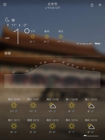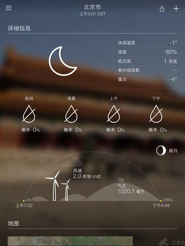 - 互动式雷达图、卫星图、高温图和风向图,加上日出/日落时间;