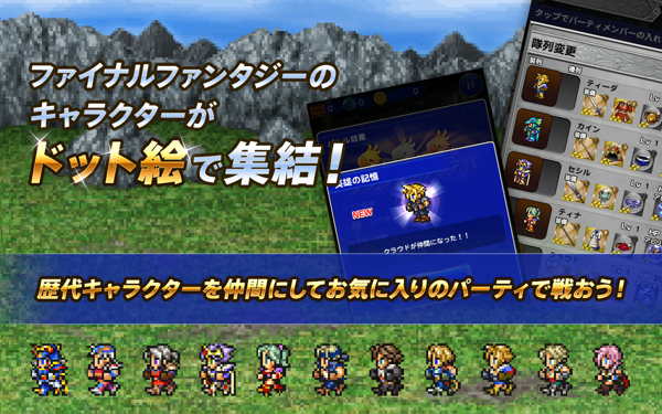 《最终幻想记忆水晶 Final Fantasy :Record Keeper》Square Enix 和 DeNA 联合开发的新游,采用了点阵图式的绘画风格,讲述了主角在历代《最终幻想》的世界中历险,并与各代的主角们并肩作战的故事。游戏主角黛西在莫格博士的历史研究院工作,他在博士施展的魔法帮助下,潜入最终幻想各代世界中,揭开隐匿于其中的秘密与故事。每到一个世界,就能解锁里面的经典人物,比如《最终幻想7》里的克劳德,然后和他们一起解锁各种武器,展开精彩探险。
