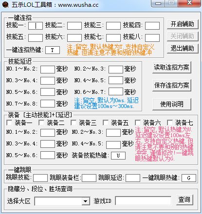 1、一键连招热键T:留空,默认热键为T.支持自定义热键.但请注意不要和别的热键冲突,谨慎修改!2、技能延迟::留空,默认为0ms.延迟建议设置100ms~300ms.