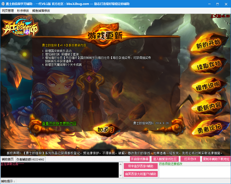 勇士的信仰岁月辅助一代下载 0.1 最新版 岁月勇士的信仰辅助是为同名的横板过关类小游戏制作的辅助修改工具,具有秒杀、装备掉落及怪物技能等多种辅助功能,可以帮助玩家降低游戏难度,可以获得更优质的游戏体验。