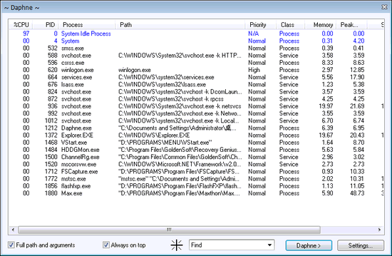 虽然 Daphne是天生的就杀了Windows进程。你可以把达芙妮作为任务经理更换。主窗口显示当前运行的进程的详细信息:CPU的使用,进程ID,进程名称,完整路径(和参数),优先级,类(过程/服务),当前内存使用情况,查看内存的使用,目前的互换使用,PEEK互换使用的线程数
