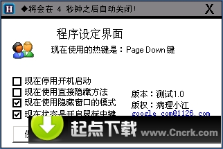 功能是能够使用自定义键,或者按下鼠标中键(即滚轮),实现某一个目标程序窗口或者全部窗口的隐藏功能,主要用于上班族的或者学生