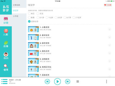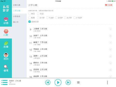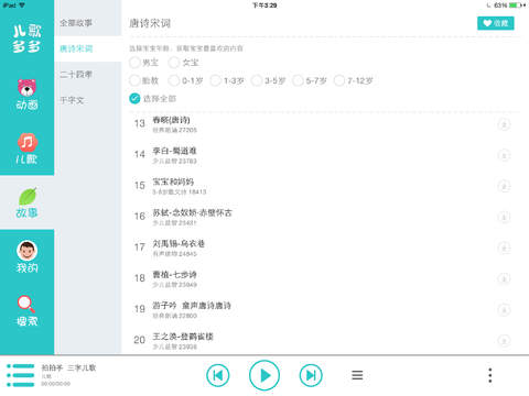 儿歌多多(儿歌播放器) v1.9.0 iPad版 儿歌多多iPad版是铃声多多团队为0-12岁儿童及家长制作的一款儿歌播放器软件,提供妈妈和宝贝最爱的胎教音乐、儿歌童谣、儿童故事、睡前童话、唐诗三字经、作文朗诵、少儿英语、百科全书等有声读物,让宝宝边听边学,给孩子一个快乐的童年。