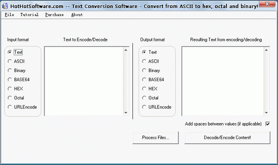 Text Conversion Software Pro V1.0 英文绿色特别版 Text Conversion Software PRO是一个是非常好用的文字转换软件。它允许你轻易地将文本在十六进制、二进制、ASCII、BASE64、HEX、Octal、URLEncode之间相互转换! 此外,您可以直接进行多个文件的批处理转换,可以通过指定一个文件扩展名批量添加文件,或者干脆输入一些文字到一个文本框并转换