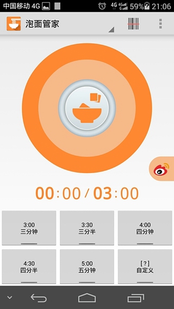 用户可以点击主界面底部任一按钮开始计时,《泡面管家》会在到达指定时限时提示用户。上部圆形计时表盘在计时过程中,点击正中间的按钮会停止计时。用户也可以向手机主屏添加快捷启动计时的小部件。