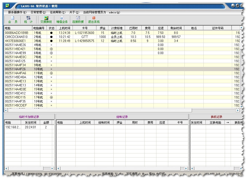 万能网吧监控计费系统SQL版本系统具有临时上机、会员上机、包时上机、更改客户端界面、结帐语音提示、任意时间任何电脑单独包时、不同客户机费率单独设置、统一费率设置、到时提醒、有开屏、锁屏、远程关机、换机、交接换班、卸载客户端和为客户机编号等功能,是集计时(按时段、按时间、最低消费标准多种计费方式相结合)收费、计帐功能于一体,如果教学用,可避免学员随意上机,学员设置上机练习时间,避免学员上满机后不认帐,教学点也可开通临时上网增加额外收入,是有盘网吧、无盘教学、无盘网吧、无盘办公的理想监控计费软件。
