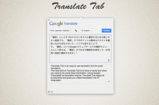 此外,Translate Tab的一个非常好用的功能就是快速翻译,在任意软件中,可以通过选择文本,然后右键->[服务]->[使用Translate Tab进行翻译],就可以快速的翻译选择的文字了,非常的易用和效率。Translate Tab Mac版是一种易于使用的快速翻译工具。翻译选项卡的本质是需要翻译一个简单的文本时您总是有的一种工具。使用谷歌翻译网络服务作为翻译单位,翻译选项卡保留其翻译功能,而且让您即刻收到 57种语言的翻译。