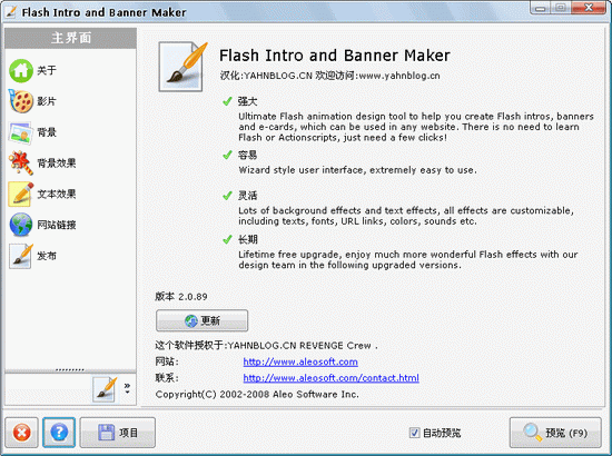 Flash Intro and Banner Builder V2.0.89 汉化绿色特别版 Flash Intro and Banner Builder是一款可以帮助设计者制作和设计动画Flash介绍、Flash标识、Flash广告、Flash弹出菜单以及任何其它Flash动画的Flash文本效果工具。你可以在几分钟之内使用你自己的照片和音乐,联合它们和动画文本以创建看起来专业的广告、标识和简介。