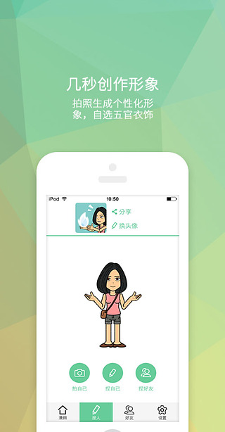 1、全新漫画社交软件,几秒迅速让你变身漫画大师!2、拍照或动手几步创造个性漫画形象,人物自由植入千余幅逗趣漫画场景中!