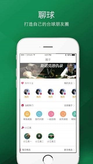 一个台球人自己的圈子,一个台球圈内的朋友圈,在这里你可以畅所欲言,在这里你可以寻找到你心中的对手,你喜欢的明星,你崇拜的偶像,在这里你可以让自己也成为台球圈知名的大咖