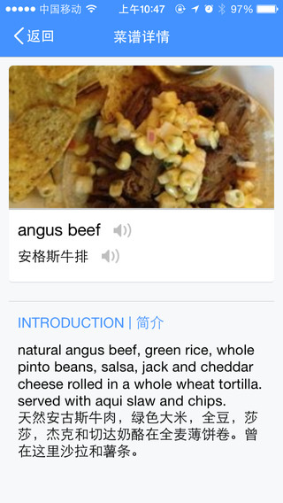 支持中英互译,只需将摄像头对准菜单即可翻译出对应的菜名,点击菜名即可出现菜品图片及简介